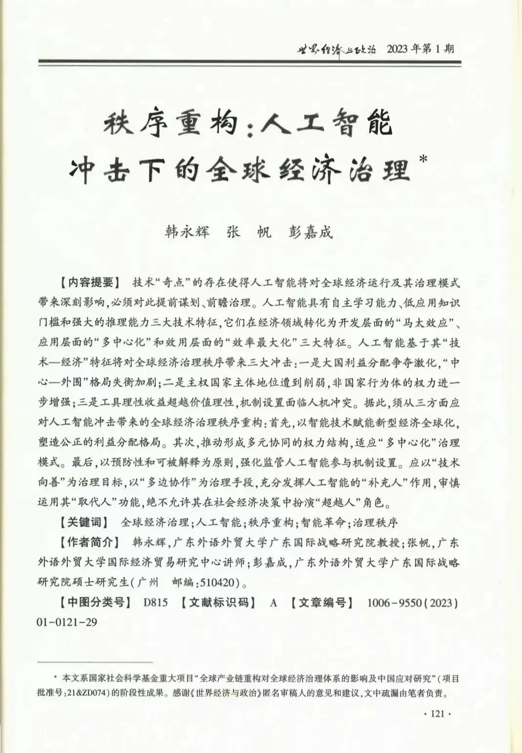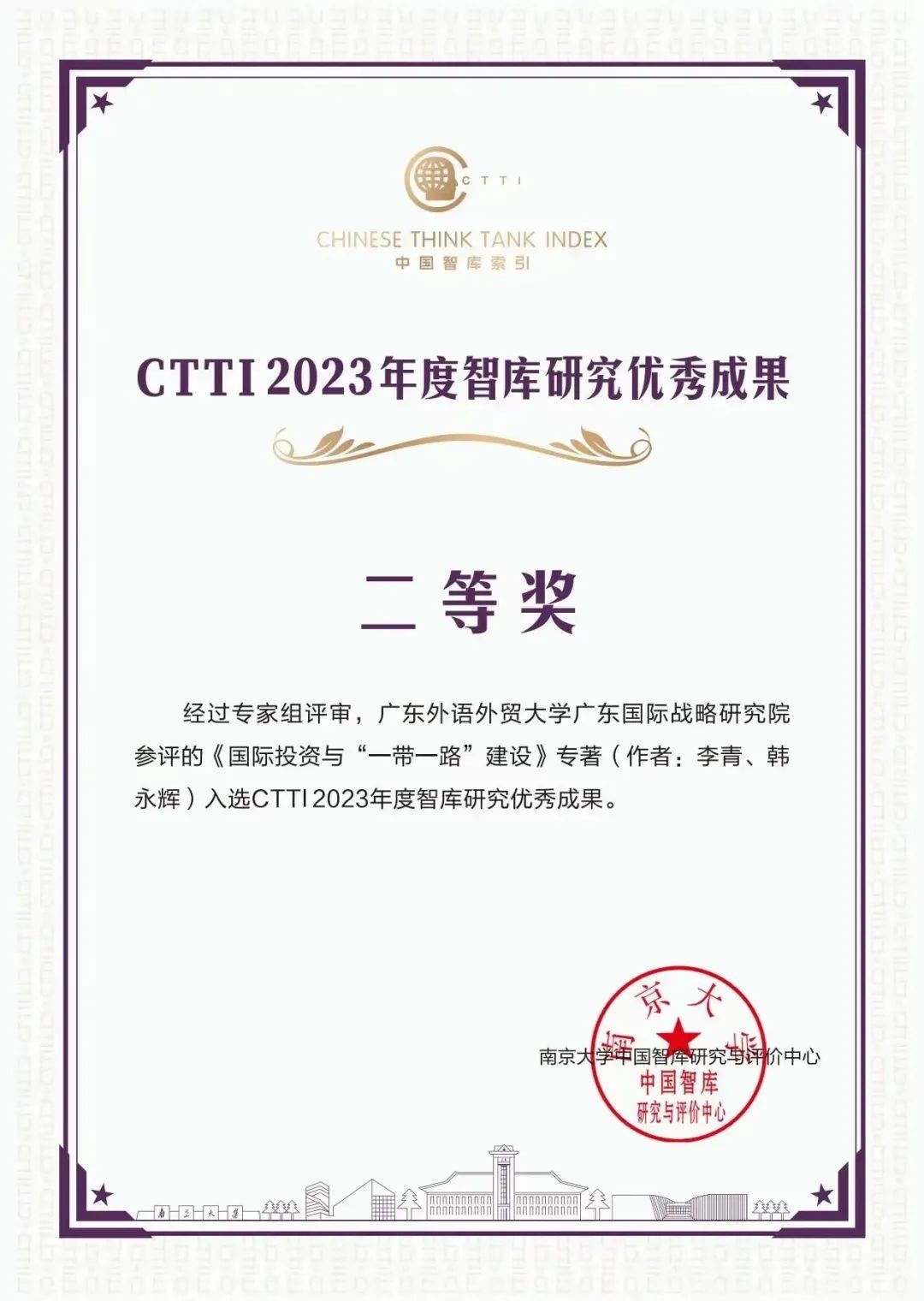 2023年,研究院专著《国际投资与“一带一路建设”》(李青及韩永辉教授)获CTTI 2023年度智库优秀成果二等奖,专著《先行先试——粤港澳大湾区建设》(李青及韩永辉教授)和《制度创新——海南自由贸易港》(陈伟光教授及刘彬)均入选改革开放新实践丛书,论文成果获第二十二届“安子介国际贸易研究奖”、广东省学习贯彻党的二十大精神理论征文成果奖、广东省人力资源研究会2022年度优秀人力资源成果奖和第十二届广东省优秀金融科研成果奖等奖项。