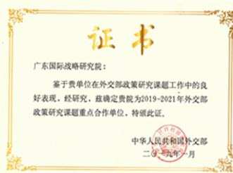 2019年,广东国际战略研究院在各类智库排名和评比中斩获佳绩,在2019年CTTI智库报告“区域研究与国际关系领域”PAI值评分排名中列全国第4名,排名较2018年上升1位;荣获中联部“一带一路”智库合作联盟2019年度“品牌活动奖”(全国仅10项);研究院续聘为外交部政策研究课题重点合作单位(2019年-2021年)和“一带一路”智库合作联盟理事单位(2019年-2022年)。