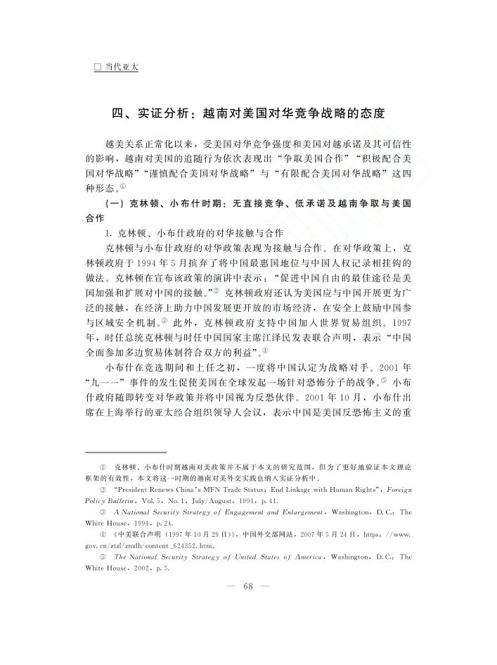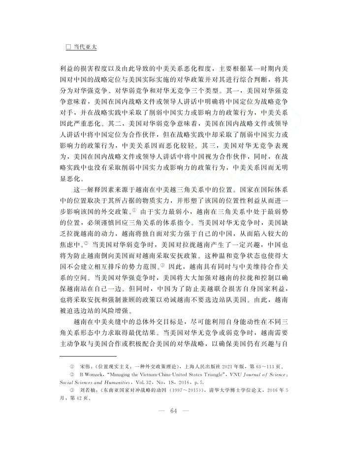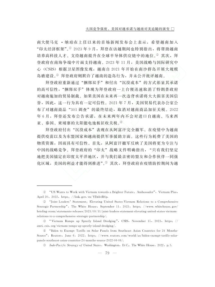 越南是美国发起对华战略竞争后积极拉拢的对象。然而,越南对不同时期的美国对华竞争战略却有着不同的回应。对 “亚太再平衡”战略表现出较高热情并积极配合,对特朗普版 “印太”战略态度谨慎,对拜登版 “印太”战略则有着一定热情并有限配合。越南对美国对华战略的态度,主要取决于美国对华战略的竞争强度与对越南的承诺及承诺的可信性。美国对华战略竞争强度决定了越南所遭受的风险大小;美国对越承诺及其可信性决定了越南所能获得的收益。奥巴马政府对华竞争强度小且对越南的承诺高/可信性高,使得越南在较小风险下可以 收 获 较 大 收 益,越 南 得 以 积 极 配 合“亚太再平衡”战略。特朗普政府对华竞争强度大但对越南的承诺可信性低,,使得越南在较大风险下收益有限,越南从而谨慎配合其 “印太”战略。拜登继续对华高强度竞争,但却提升了对越承诺可信性,使得越南在较大风险下的收益上升,使其愿意有限配合拜登政府的 “印太”战略。随着大国竞争长期化,越南将坚持更为审慎的 “竹式外交”,其政策行为将随中美关系的变化和美国对越政策的波动而变化。对此,中国应推进 “中越命运共同体”建设,并对越美政治配合与安全合作保持警惕。