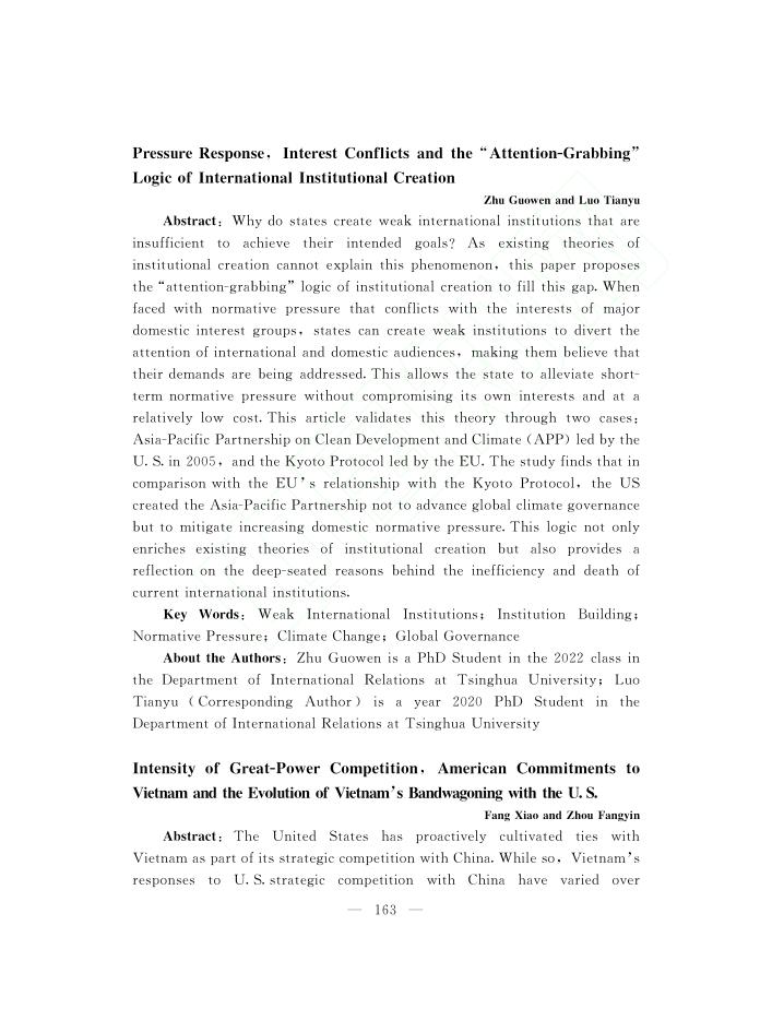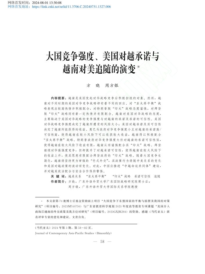 我院博士后方晓及我院副院长周方银教授合著的文章《大国竞争强度、 美国对越承诺与越南对美追随的演变》发表于《当代亚太》(CSSCI、一类B)。