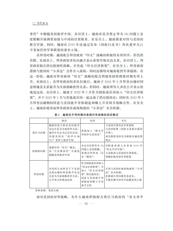 文章分析了越南对美国不同时期对华战略的不同回应。越南在奥巴马的"亚太再平衡"战略中表现出积极态度,因为风险小、收益大;对特朗普的"印太"战略持谨慎态度,因风险大、收益有限;而对拜登版的"印太"战略则有一定热情,因为虽然风险依旧,但收益有所上升。越南的回应主要取决于美国战略的竞争强度和对越承诺的可信性。文章认为,越南将采取审慎的外交政策,中国应推进 “中越命运共同体”建设,同时对越美合作保持警惕。