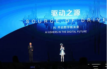 2021年7月8日,在2021世界人工智能大会开幕式上,主持人和AI虚拟主持互动。(新华社图片)