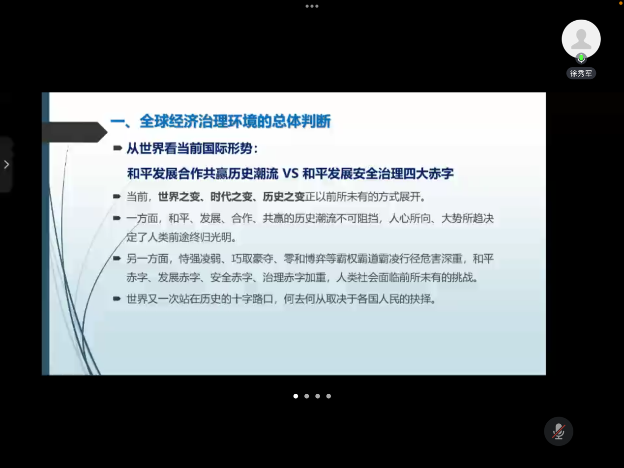 21日上午,中国社会科学院世界经济与政治研究所/国家全球战略智库国际政治理论研究室主任,徐秀军研究员以“全球经济治理新趋势与中国对外战略选择”为题开展讲座。他认为,当前世界之变、时代之变、历史之变正以前所未有的方式展开,新形势下中国对外战略应构建以国内大循环为主体,国内国际双循环相互促进的新发展格局。