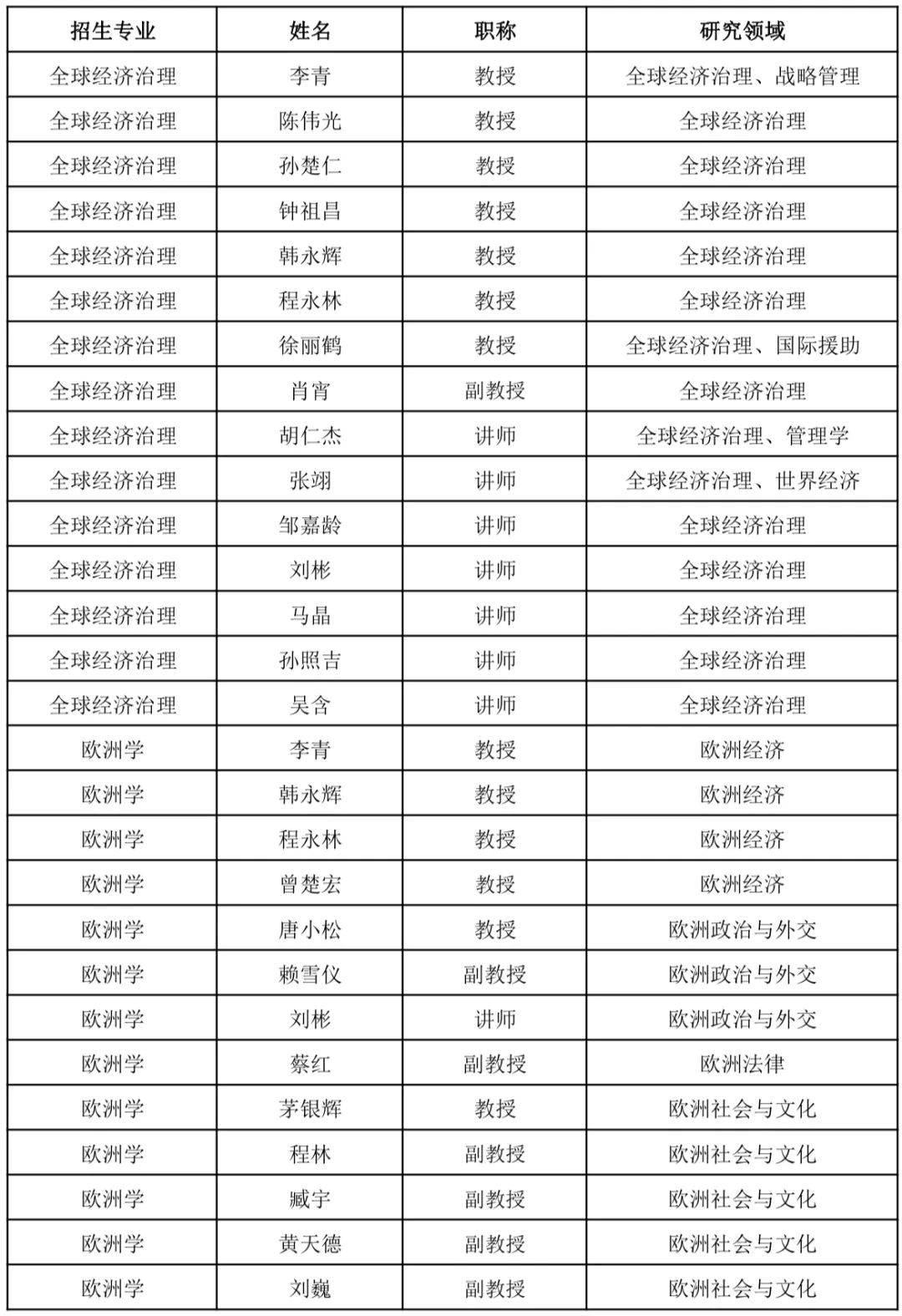 研究院拥有一支国务院政府特殊津贴专家、广东省优秀社会科学家、珠江学者特聘教授、珠江青年学者、南粤优秀教师等为代表的高职称、高学历、高水平的师资队伍,教授21名,副教授7名。聘请了澳大利亚人文学院院士马克林教授、加拿大多伦多大学科顿教授等国内外诸多著名学者担任特聘研究员。导师队伍实力雄厚,现有全球经济治理硕、博士研究生导师15名,欧洲学硕士生导师13名,国别和区域研究博士生导师2名,导师队伍中有国家社科基金重大项目首席专家8名,承担10余项国家社科重大项目,青年导师均主持国家级课题。